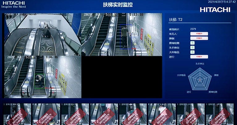 2. 导入日立的AI视频分析系统。通过摄像设备实时监测乘客的异常行为,基于AI算法分析乘客行为是否存在安全风险,降低因乘客拥堵、滞留、头手伸出扶手带、攀爬或跌倒而引发安全事故的几率。