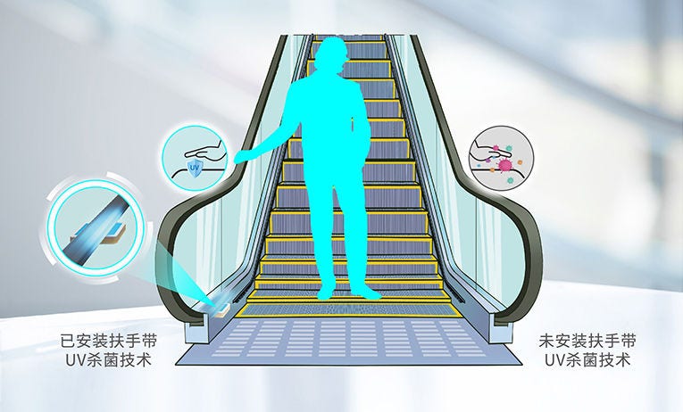 除了预防的措施,有效“杀菌和抗菌”则是一种更为主动的方案,这也是消除乘客搭载电梯担忧的另一重要环节。幸而日立电梯在医用及消防领域早有技术储备,使一系列“消杀”方案得以快速面市。例如,为了避免在乘梯过程中意外交叉感染,日立电梯提供了抗菌按钮的方案选项:按钮字片上的高效防菌银离子能牢固吸附细菌表面,并与之发生反应。这意味着细菌在按钮表面将难以存活。再如,采用日立电梯的空气净化系统可保证电梯轿厢内的空气净化度,从而有效限制气溶胶的传播方式。通过纳米水离子除菌发生装置,能聚集空气中的水分,并施以高压分离空气中的水分子,产生大量带电的水粒子。在遇到细菌时,纳米水离子中的OH自由基会抽出细菌中的氢元素,转变为纯水,令细菌的蛋白质变性而失去活性,从而达成抑菌效果。此外,根据国家卫健委的报告显示,新冠病毒对紫外线与热度敏感。紫外线杀菌成为一个非常不错的电梯内细菌“消杀”加装选项。基于日立集团在专业医疗系统利用紫外线杀菌的技术方案,电梯公司适时调整了产品配置方案,为不同场景内的电扶梯产品提供安全防护。比如,在电梯轿厢内装配波长254nm的紫外线杀菌灯,并通过系统自动检测在电梯空闲(无乘客)时开启,实现电梯轿厢的全方位杀菌消毒;在自动扶手梯内置加装波长270~285nm的紫外线照射设备,实时对扶手带和梯级进行杀菌消毒,降低了人流密度区域细菌和病毒交叉感染的风险。