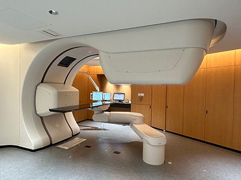 此套系統設置於臺北榮民總醫院全新的重粒子癌症治療中心,目前配備兩間可從水平和垂直照射治療的診療室。此套系統搭載了動體追蹤技術,能精準捕捉隨呼吸移動的器官,以及具備掃描照射技術,可根據腫瘤形狀進行精確的重粒子線照射。